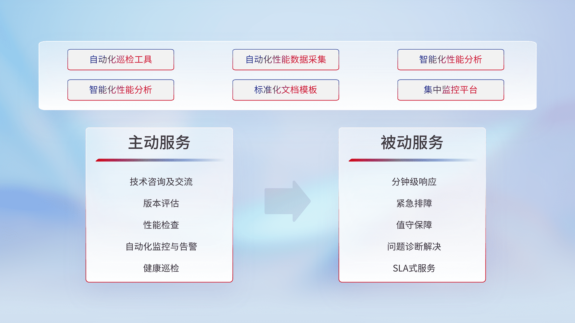 智能化工具和标准化文档,,,,保障服务质量,,,,提供主动服务(包含技术咨询、、版本评估、、、、性能检查、、、自动化监控与告警、、、健康巡检)和被动服务包含(分钟级响应、、、紧急排障、、值守保障、、、、问题诊断解决、、SLA服务)。。。。